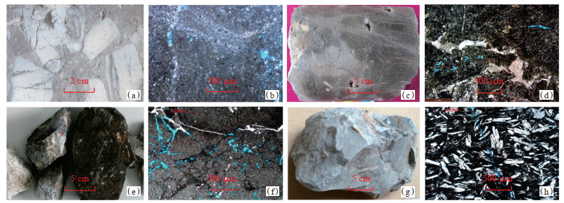 下载原图 图 2 南堡凹陷二号断裂带古生界碳酸盐岩潜山各类储层岩石学特征 (a)岩溶角砾云岩,颗粒分选磨圆差,角砾状结构,角砾内发育裂缝,岩心照片,NP1井,马家沟组,3 491.56 m;(b)岩溶角砾云岩,可见溶孔及裂缝,孔径变化差异较大,裂缝多被方解石充填,薄片照片,NP1井,马家沟组,3 491.70 m;(c)泥粉晶灰岩,可见沿裂缝较发育的溶蚀孔洞,岩心照片,NP7井,冶里组,3 642.23~3 642.33 m;(d)泥晶灰岩,泥晶结构,见未充填裂缝和沿裂缝发育的溶蚀孔,薄片照片,NP7井,冶里组,3 645.65 m;(e)粉-细晶白云岩,裂缝发育,岩心较为破碎,含油饱满,岩心照片,NP6井,亮甲山组,3 425.75~3 425.95 m;(f)粉晶白云岩,孔隙及裂缝均较为发育,薄片照片,NP6井,亮甲山组,3 437.66 m;(g)安山岩,块状构造,岩性致密,岩心照片,NP4井,凤山-长山组,3 681.10~3 681.20 m;(h)安山岩,斑状结构,斑晶主要为长石,中部见1条微裂缝,未充填,薄片照片,NP4井,凤山-长山组,3 681.23 m Fig. 2 Petrological characteristics of various reservoirs of Paleozoic carbonate buried hill in No. 2 fault zone of Nanpu Sag |
