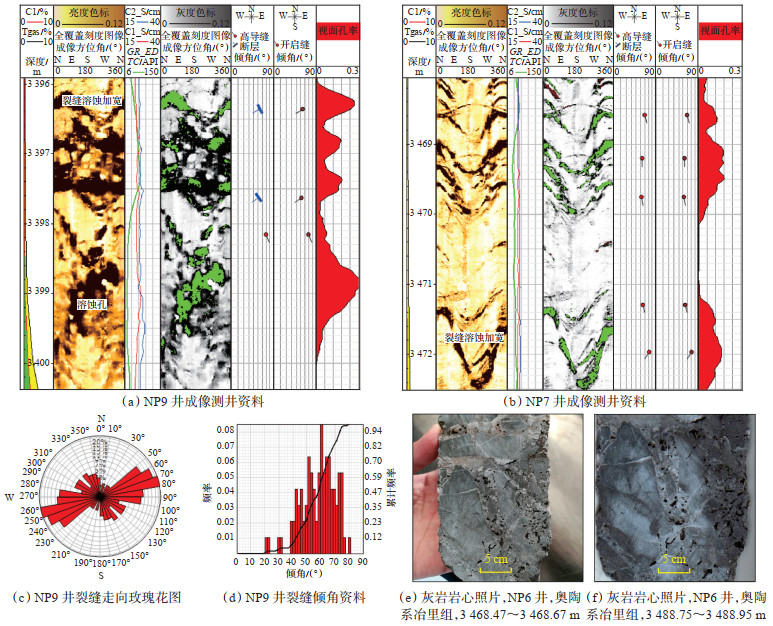 裂缝对储集空间有2方面重要的控制作用,一方面裂缝自身可以储集油气,另一方面裂缝沟通相邻的孔洞,从而形成缝洞系统,改善了储层渗流能力[10]。通过岩心及薄片观察,主要发育构造缝和溶蚀缝2种类型,其中构造缝按裂缝倾角大小由高到低可分为垂直缝、高角度缝、斜交缝和低角度缝,其走向为近北东向和近北西向,与主控断裂走向一致;溶蚀缝则多为沿构造缝溶蚀形成,在成像测井及岩心上可常见裂缝溶蚀加宽现象[图 3(a)-(d)]。
