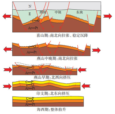 3.1 古地貌和裂缝控制了岩溶储层的发育和分布通过潜山储层段成像测井资料分析,裂缝走向以北东方向为主,其次为北西方向,2组裂缝的走向与区域构造断裂的走向一致。结合薄片资料,沿裂缝常形成溶蚀孔洞,从而组合成缝洞系统,反映了裂缝对储层具有明显的控制作用。根据区域构造演化分析,在加里东-海西期构造运动相对较弱,古地貌平缓,太古界、元古界和古生界之间为平行不整合沉积;进入印支期开始,区域上开始出现大规模构造抬升运动,在北东向应力挤压作用下主要发育了4组北西向断裂,形成了东南高西北低的构造格局,并且构造高部位开始遭受风化剥蚀,岩溶作用发育;到了燕山早期,盆地开始受到北西向挤压作用,在地质应力作用下,构造格局进一步复杂,东块相对于西块抬升并继续遭受风化剥蚀,同时断裂发育程度得到进一步加强,该时期主要形成了3组北东向断裂,将整个构造区划分为现今的西块、中块和东块;进入燕山中晚期,构造反转,盆地开始受到北西向拉张作用,在地质应力作用的影响下,东南高西北低的地貌形态更加凸显;进入喜山期后,盆地主要受北东向拉张作用逐渐伸展沉降,断裂系统也进一步复杂化,并在古生界地层之上开始沉积新生界地层(图 4)。整体上来看,受印支和燕山早期挤压应力作用,形成2组断裂体系,控制了岩溶储层的分布范围和发育程度[15-16]。