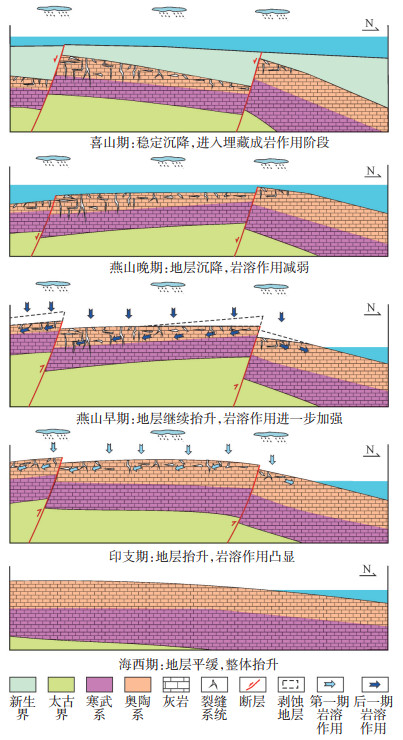 从构造演化过程可以看出,受印支期北东向应力强挤压作用,南堡凹陷二号断裂带古生界潜山形成了东南高西北低的构造格局,整体上地层开始抬升,遭受风化剥蚀,大气降水通过裂缝和溶蚀的孔洞下渗,并顺着地层倾向发生第1期岩溶作用;进入燕山早期,受燕山早期西北向应力挤压作用,地层进一步抬升,古潜山暴露范围渐渐扩大,后期岩溶作用会在前期的基础上继续风化剥蚀,因此其岩溶作用范围逐渐加深且范围也逐步加大,同时,构造高部位受风化作用的影响开始破碎,并向湖盆中心搬运,导致其古生界地层厚度相对构造斜坡处变薄;燕山中晚期开始,构造开始反转,受北西向拉张作用的影响,盆地开始沉降,湖平面上升,岩溶作用逐渐减弱,并在古生界地层之上开始沉积新生界地层(图 5)。从岩溶作用演化模式可以看出,岩溶高地和岩溶斜坡是风化淋滤作用最强的地区,因此也是岩溶作用最发育的区域,但岩溶高地由于受到剥蚀搬运其岩溶储层难于保留,故岩溶斜坡带为岩溶储层的有利发育区,而岩溶洼地为汇水区,溶蚀作用较弱,岩溶储层厚度较薄,整体上岩溶储层纵剖面上呈透镜状分布[17]。