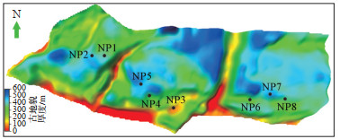 另外,古地貌中坡度陡缓对岩溶储层发育程度也具有控制作用,坡度缓水流速度慢,流水相对存留时间长,垂向渗水量大,岩溶作用强。反之,坡度陡水流速度快,流水存留时间短,岩溶作用弱,因此岩溶缓坡是岩溶斜坡带中储层发育的最有利地带[24]。对于缓坡带的NP4和NP6井,地层倾角小于15°,岩溶储层厚度200~220 m,净毛比59%~68%;陡坡带NP1和NP8井,地层倾角15°~35°,岩溶储层厚度80~150 m,净毛比44%~52%(表 1)。
