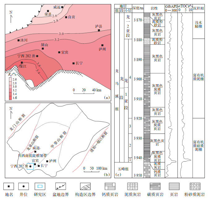 下载原图 图 1 川南地区地质概况(a)、川南地区龙一段Ro等值线(b)[10]与宁西地区宁西202井岩心柱状图(c) Fig. 1 Geological overview of southern Sichuan Basin(a), Ro contour map of Long 1 member(b) and core histogram of well Ningxi-202 in Ningxi area(c) |