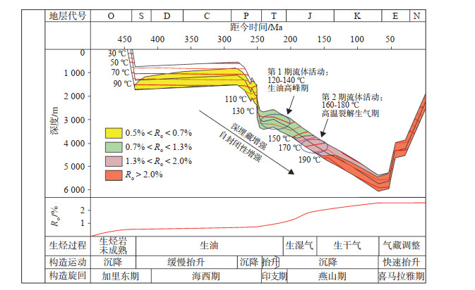 3 沉降史与生烃史使用一维盆模软件BasinMod,以川南宁西地区宁西202井实钻地层分层、实测岩石热导率、热流值和TOC含量等数据为基础,生烃史采用平行化学反应模型,对五峰组—龙马溪组沉降史和生烃史进行定量模拟(图 2),研究该地区五峰组—龙马溪组的埋深沉降史、热演化史及生烃史。五峰组—龙马溪组经历了多期构造运动,使川南地区经历了不同程度的抬升剥蚀,依据以往研究人员[14-16]的研究结果,加里东期、海西期、印支期和燕山—喜山期古剥蚀量分别设定为200 m,150 m,200 m和2 000 m。