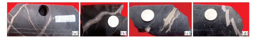 下载原图 图 3 宁西地区宁西202井龙马溪组一段黑色炭质页岩岩心脉体特征 (a)剪节理中充填方解石脉体,3 853.51 m;(b)张性、剪性微裂缝、节理中充填方解石脉体,3 889.83 m;(c)剪节理中充填方解石脉体,3 926.00 m;(d)多期剪性裂缝中充填方解石脉体,3 946.53 m Fig. 3 Core vein characteristics of well Ningxi-202 in Ningxi area |