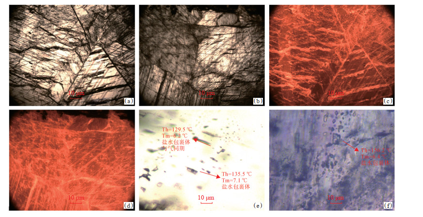 在岩心观察基础上,采集宁西202井11个样品进行包裹体观察、测温、阴极发光等测试,包裹体形状以椭圆状、次圆状和不规则形状为主,大小为3~15 μm,多为5~10 μm,以群状和带状分布为主。如图 4所示,在3 834.23 m,3 932.75 m这2处黑色页岩段取得的裂缝脉体样品,在单偏光镜下均可见方解石脉体,节理清晰可见[图 4(a)—(b)],阴极发光显微镜下方解石均呈暗橘黄色—亮橘黄色—亮黄色的特征,显示出方解石的多期性,其中铁方解石呈暗色阴极发光特征[图 4(c)—(d)],对气-液两相盐水包裹体测温,前者呈群状分布,其均一温度约为130 ℃[图 4(e)],后者为呈带状分布,其均一温度约156 ℃[图 4(f)]。