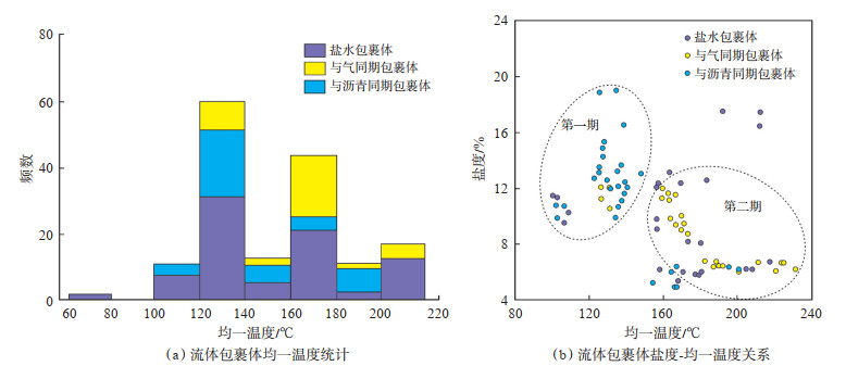 6 结论(1) 川南宁西地区宁西202井五峰组—龙马溪组有2期流体包裹体特征,第一期是与沥青共生的盐水包裹体,均一温度为100~150 ℃,冰点温度为-12~-4 ℃,盐度为6%~12%;第二期是与气共生的盐水包裹体,均一温度为160~220 ℃,冰点温度为-14~-6 ℃,盐度为7%~12%。盐水包裹体均一温度具有特征明显的双峰特征,代表 2期主要的流体活动,第一期均一温度峰值带为120~140 ℃,代表五峰组—龙马溪组生油高峰期流体活动过程,第二期均一温度峰值带为160~180 ℃和200~ 220 ℃,代表五峰组—龙马溪组生气高峰期的流体充注活动过程。