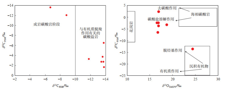 通过分析经典碳同位素和氧同位素流体来源模式,发现宁西202井方解石脉体主要有2种成因,对应2种不同的流体来源[24]。第一期方解石脉体为有机质脱羧作用的产物,其流体来源于液态烃类有机质,δ13 C为-6.56‰~-1.58‰,分布于与脱羧作用有关的碳酸盐岩区域内(图 6),表现为碳同位素负偏,碳同位素负偏可能与生油窗有机质的脱羧作用所提供的具有亏损特征的碳源有关,有机碳的混入使得方解石脉体碳同位素负偏。第二期方解石脉体是甲烷热氧化的产物,其流体来源为富含甲烷的有机流体,分布于成岩碳酸盐岩区域内(图 6),比第一期流体碳酸盐岩负偏严重,一般情况下,大气CO2混入和高演化有机碳会使得碳同位素严重负偏。这2种情况可以通过脉体中发育的流体包裹体来区分,流体包裹体表现为高温、高盐度特征,排除了大气CO2的影响,推测为有机质的氧化作用导致碳同位素严重负偏[25]。