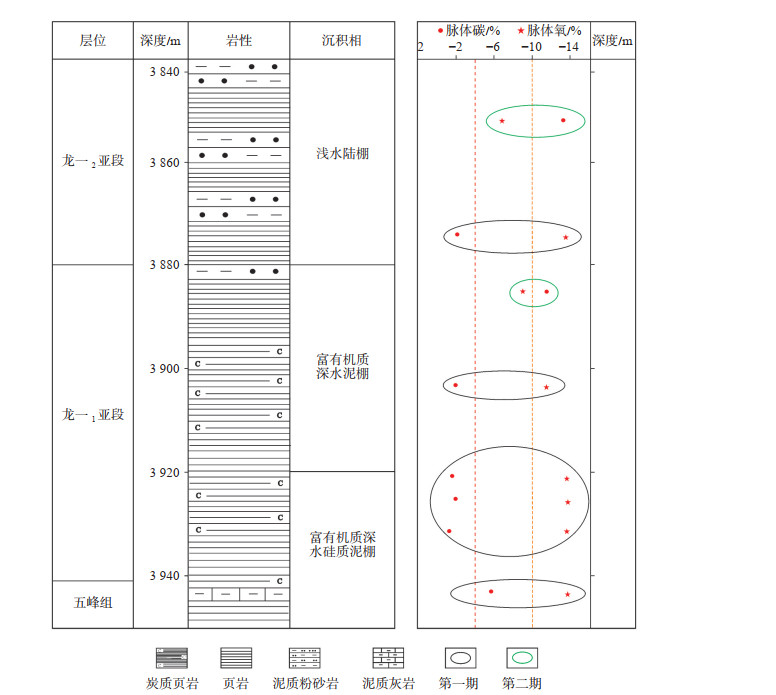 (2) 成岩流体的碳氧同位素在深度上的差异由沉积时的环境变化引起,受沉积环境变化、脱羧作用、有机质氧化作用影响。这种差异表明宁西地区五峰组—龙马溪组至少有2期大规模流体活动,第一期主要活动于龙一1亚段,为液态烃类流体,脉体δ13 C为-6.56~-1.58‰,平均值为-3.45‰,δ18 O为-13.72‰ ~-11.06‰,平均值为-13.32‰,对应生油阶段;第二期活动于龙一2亚段,为高温富含甲烷的有机流体,δ13C为-13.27‰~-12.16‰,平均值为-12.72‰,δ18O为-9.06‰~-6.61‰,平均值为-7.84‰,对应油裂解生气阶段。