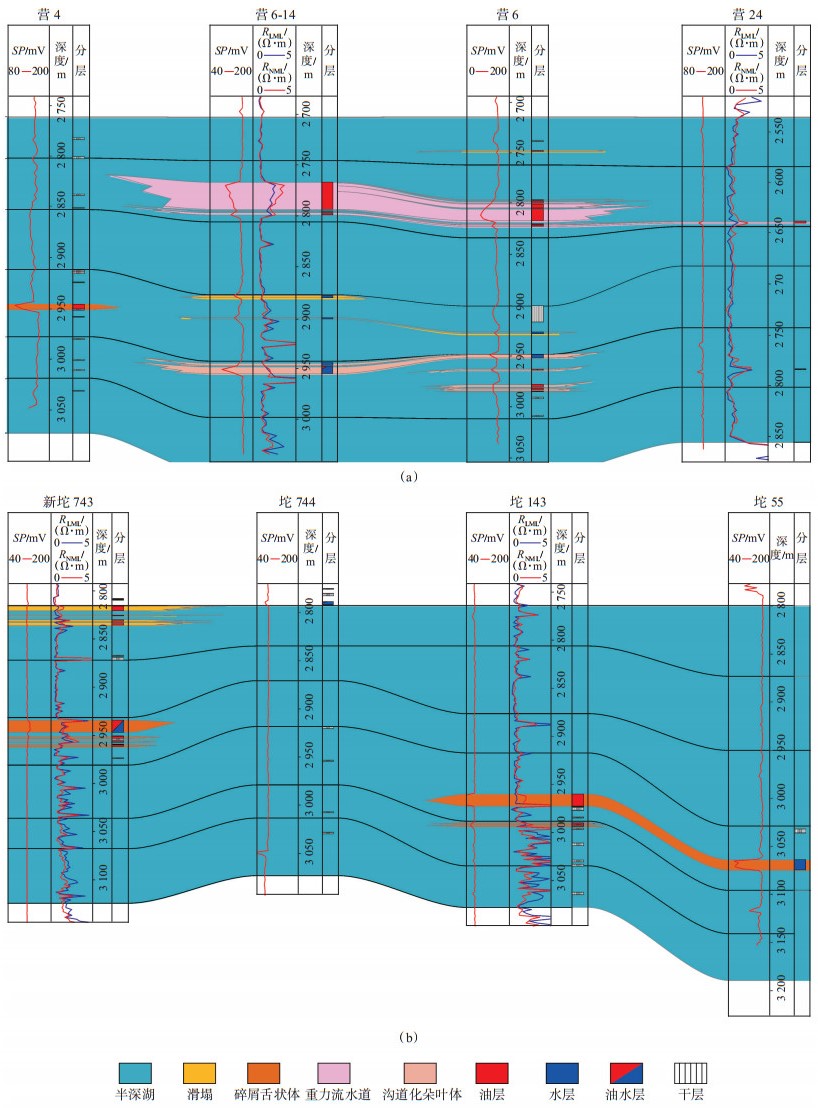 (1)东营凹陷营北地区沙三中亚段水道控制型沉积包括了重力流水道和前端复合体2类沉积亚相,重力流水道亚相包括重力流水道微相和堤岸微相。前端复合体亚相包括沟道化朵叶体微相、碎屑舌状体微相、浊积朵叶体微相和浊积席状体微相。重力流水道、沟道化朵叶体和碎屑舌状体具有典型的砂质碎屑流沉积特征,浊积朵叶体和浊积席状体具有不完整鲍玛序列的浊流沉积特征。