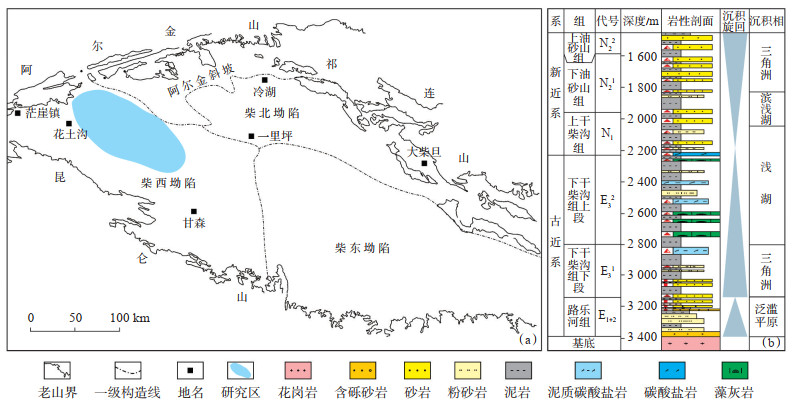 碳酸盐岩油气在世界油气资源中具有重要地位, 全球碳酸盐岩储层中的油气储量约占总储量的40%, 其产量约占总产量的60%[1]。我国是一个以陆相生油为主的国家, 湖相碳酸盐岩的分布广泛, 最早沉积于二叠纪, 一直延续到新近纪, 古近纪是我国湖相碳酸盐岩沉积的鼎盛时期, 如黄骅坳陷古近系沙河街组、苏北盆地古近系阜宁组和柴达木盆地下干柴沟组上段[2]。经过数十年的勘探, 我国已在湖相碳酸盐岩中探明油气总储量高达数亿吨, 勘探潜力巨大[3-4]。针对国内湖相碳酸盐岩, 学者们已从沉积韵律、岩相组合、烃源岩评价、储集空间、渗流特征等方面开展了大量研究, 如: 王义武等[5]认为东濮凹陷沙河街组四段碳酸盐岩沉积受湖水化学组分和生物生产力等2个因素的共同控制; 李晓光等[6]提出了辽河坳陷大民屯凹陷沙四段湖相页岩油"三品质"评价方法, 为页岩油"甜点"选取提供了方法和依据; 张锐锋等[7]认为渤海湾盆地冀中坳陷束鹿凹陷沙三下亚段纹层状泥灰岩生烃潜力最强; 蔚远江等[8]研究认为渤海湾盆地歧口凹陷沙一段源储一体发育4类源储配置, 源储叠合区主要分布在凹陷中心、宽缓斜坡的中-低斜坡区; 李书琴等[9]通过层序地层方法研究了准噶尔盆地吉木萨尔凹陷芦草沟组湖相混积岩沉积特征; 李二庭等[10]通过氯仿抽提的方法对准噶尔盆地吉木萨尔凹陷芦草沟组烃源岩进行了精确评价; 张治恒等[11]认为吉木萨尔凹陷芦草沟组储层发育主要受沉积和成岩双重作用控制; 黄华等[12]研究了江汉盆地古近系潜江组盐湖沉积特征, 提出了非常规混积岩油藏具有"沉积控区块、源岩控层位"的特征; 刘江艳等[13]研究了江汉盆地新沟油田新沟嘴组盐韵律, 指出盐韵律的形成是湖平面上升-下降不断变化的直接响应。这些研究表明了湖相碳酸盐岩既是烃源岩又是储集层, 源储一体, 是致密油、页岩油勘探的重要领域。柴达木盆地新生代以来逐步演化为咸化湖盆, 湖相碳酸盐岩分布广泛, 尕斯藻灰岩、英西泥灰岩储层在十几年前就引起了勘探家们的关注[14-15], 随着盆地油气勘探的深入, 近年来在英西、南翼山、风西、黄瓜峁等地区的油气勘探取得了重大进展, 柴达木盆地湖相碳酸盐岩研究也更加深入, 纪友亮等[16]通过野外露头、钻井资料等将柴西新生界湖相碳酸盐岩划分为5种沉积微相, 并指出不同沉积微相的时空分布, 建立了柴西湖相碳酸盐岩的沉积模式; 易定红等[17]通过地球化学分析方法指出了英西碳酸盐岩分布于湖盆沉积中心, 水体盐度是其岩性变化和发育程度的主要控制因素; 张道伟等[18]通过岩心分析, 结合测井技术揭示了英西页岩油具有"源内成藏、整体含油"的特征; 袁剑英等[19]通过大量实验指出英西碳酸盐岩中白云石为准同生交代成因, 并明确了晶间孔发育机制; 李翔等[20]通过构造分析、岩相组合分析提出英西碳酸盐岩裂缝发育机制; 张永庶等[21]通过微电阻率扫描成像(FMI)测井和岩性扫描(LS)测井研究了黄瓜峁地区碳酸盐岩的沉积微相及空间分布; 李翔等[22]总结了西岔沟各类微生物岩岩石学、沉积特征, 指出各类微生物岩的沉积环境。但针对盆地不同类型湖相碳酸盐岩缺乏对比研究和系统总结。