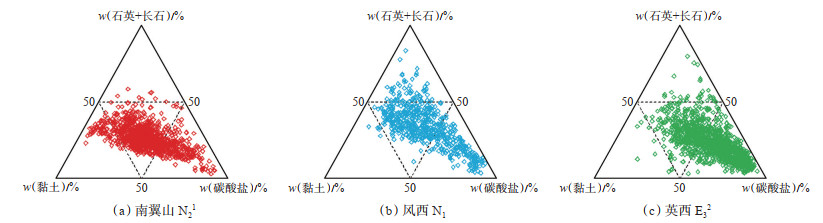 下载原图 图 3 柴西地区湖相碳酸盐岩主要矿物三角图 Fig. 3 Triangular diagram of main minerals of carbonate rocks in western Qaidam Basin |