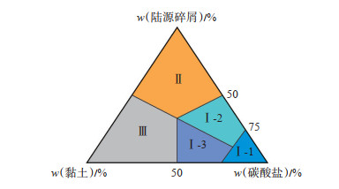 下载原图 图 4 柴西地区混积碳酸盐岩三端元分类图 Ⅰ-1. 碳酸盐岩;Ⅰ-2. 砂质碳酸盐岩;Ⅰ-3. 泥质碳酸盐岩;Ⅱ. 砂岩;Ⅲ. 泥岩 Fig. 4 Three-terminal element classification map of mixed carbonate rocks in western Qaidam Basin |
