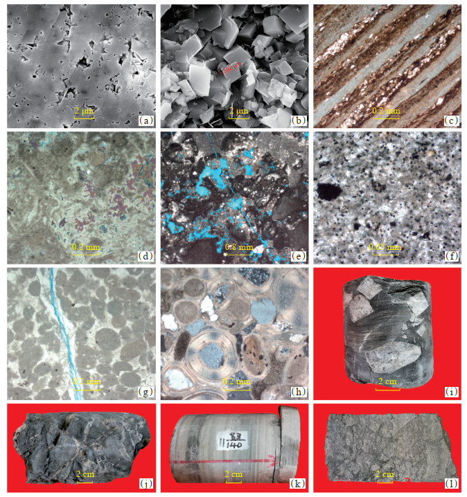 (2) 纹层状碳酸盐岩。纹层状碳酸盐岩沉积于较深水体, 碳酸盐与富有机质黏土或粉砂形成密集的韵律纹层, 纹层发育程度受湖水补给、盐度、微生物、季节等多因素控制[29], 单纹层厚度约0.2 mm (图 5c), 偶见硬石膏斑晶分布, 呈立方体状, 斑晶粒径可达1.0 cm(图 5i); 储集空间除了晶间孔还发育顺层微裂缝(图 5c); 有机质含量高, 是探索页岩油勘探主要岩石类型。