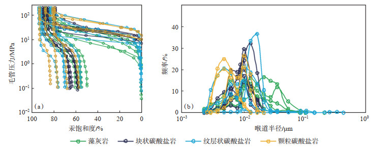 4 物性特征及孔隙结构柴西地区湖相块状碳酸盐岩储集空间以晶间孔为主, 孔径小, 但数量多, 平均孔隙度为10.6%, 平均基质渗透率为0.03 mD, 排驱压力为10.0 MPa, 平均孔喉半径为0.038 μm; 纹层状碳酸盐岩较块状碳酸盐岩泥质含量高, 泥质含量不仅影响孔隙度的大小, 也影响孔隙半径的大小, 其孔隙度较块状碳酸盐岩孔隙度低, 平均为7.4%, 但由于顺层微裂缝的发育, 渗透率较块状碳酸盐岩高, 平均渗透率为0.76 mD, 排驱压力为11.5 MPa, 平均孔喉半径为0.071 μm; 藻灰岩储集空间主要以藻格架孔为主, 溶蚀作用改造明显, 孔隙半径大, 表现为高渗透率, 低排驱压力, 平均孔隙度为10.1%, 平均渗透率为9.09 mD, 排驱压力为3.2 MPa, 平均孔喉半径为0.117 μm; 颗粒碳酸盐岩由于分选差以及胶结作用影响, 粒间孔已消失殆尽, 储集空间以白云石晶间孔为主, 物性及孔隙结构与块状碳酸盐岩类似, 平均孔隙度为7.4%, 平均渗透率为0.01 mD, 排驱压力为15.0 MPa, 平均孔喉半径为0.026 μm; 总体上, 研究区湖相碳酸盐岩为低孔特低渗致密储层(表 3、图 6)