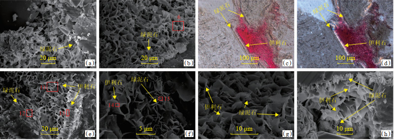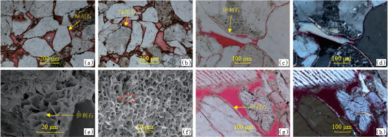 Ⅱ型包膜(绿泥石-伊利石包膜): 绿泥石和伊利石一起形成等厚状黏土包膜, 在颗粒接触处缺失(图 2c)。偏光显微镜下该类包膜具有明显的双层结构, 单偏光镜下包膜外层无色、内层为淡绿色, 均未吸附重质油(图 2c), 正交偏光镜下外层干涉色为一级黄红、内层为一级暗灰色(图 2d), 表明外层为伊利石, 而内层以绿泥石为主; 扫描电镜下, 伊利石为15 μm左右垂直颗粒表面的弯曲片状, 伊利石晶间孔隙十分发育, 在颗粒接触处附近或伊利石局部不发育区, 可见较伊利石小的竹叶状绿泥石出露(图 2e-2h)。