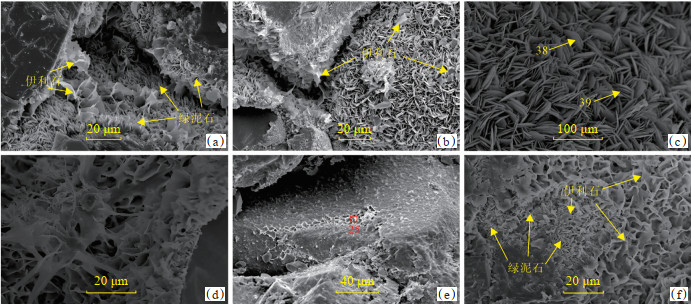 Ⅲ型包膜(含伊利石绿泥石包膜): 以绿泥石为主, 含少量伊利石。偏光显微镜下, 因伊利石含量少, 这类包膜和常见的绿泥石包膜一样, 常吸附较多的重质油而呈褐色乃至黑色; 在扫描电镜下, 绿泥石包膜表面偶然可见少量伊利石晶体, 伊利石为15 μm左右的弯曲片状, 但伊利石并非生长于绿泥石晶体之上, 而是扎根于绿泥石包膜内, 以颗粒表面为基底垂直生长(图 3a-3b)。