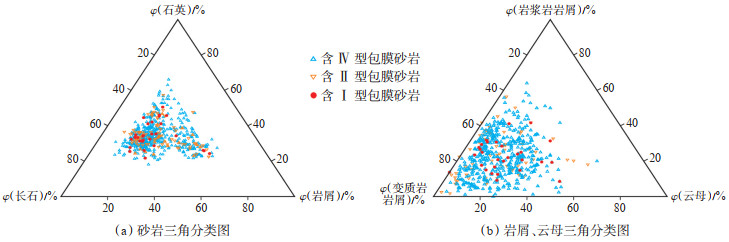 除极细砂岩外, 其他砂岩均可见伊利石包膜, 由于延长组砂岩受东北物源、西南物源和西部物源体系控制, 不同油层组和地区, 岩性差异较大, 从岩性三角分类图来看(图 4a), 含不同类型黏土包膜的砂岩, 在岩性分类上无明显差异, 主要为岩屑长石砂岩, 其次为长石砂岩和长石岩屑砂岩。在现今残余岩屑组成上, 含不同类型黏土包膜的砂岩也无明显区别(图 4b), 均以变质岩岩屑为主, 其次为喷出岩、花岗岩等岩浆岩岩屑, 沉积岩岩屑难见, 含有较多的云母碎屑。