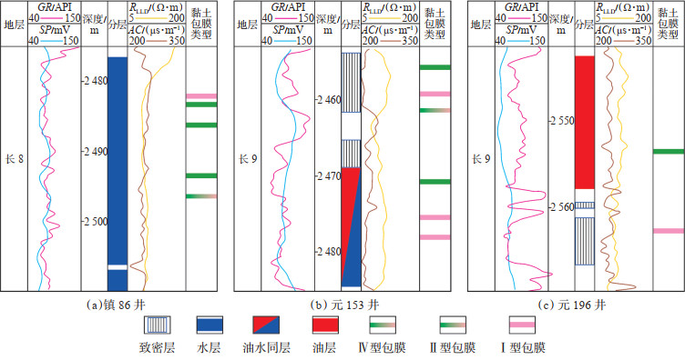 (4) 绿泥石包膜易吸附重质油, 导致孔隙度降低, 同时导致岩石润湿性表现为弱亲油[66], 不利于油气的开采; 而伊利石具有较强的离子交换能力, 大量吸附水附着在颗粒表面, 使之具有亲水或弱亲水特征[65, 67-68], 有利于油气的开发, 这是庆城长7致密油开发优于陕北新安边长7致密油的重要因素。