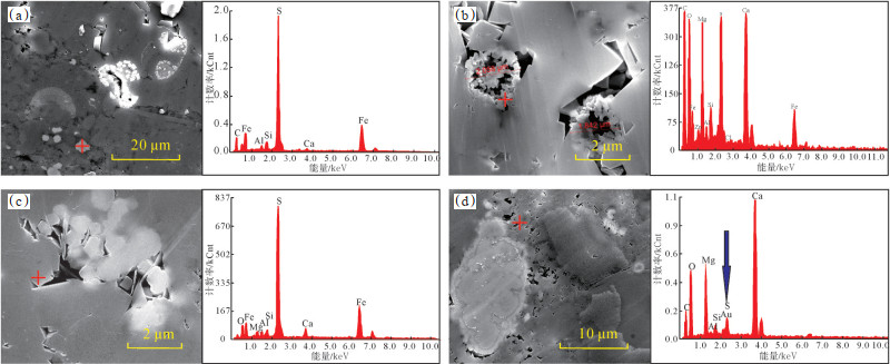 下载原图 图 2 柴达木盆地英西地区下干柴沟组上段TSR的扫描电镜及能谱图 (a)黄铁矿发生溶蚀改造, 见孔洞与白云石, 狮38-2井, 3 516.88 m; (b)莓球状黄铁矿被强烈溶蚀, 狮41-2井, 4 071.86 m; (c)黄铁矿沉淀在孔隙边缘, 狮49-1井, 3 780.90 m; (d)能谱图显示黄铁矿周缘的白云石中混有S元素, 狮41-2井, 4 072.55 m Fig. 2 Scanning electron microscopy and energy spectrum of TSR of the upper member of Xiaganchaigou Formation in Yingxi area, Qaidam Basin |