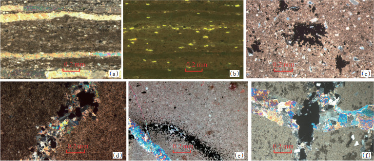 下载原图 图 3 柴达木盆地英西地区下干柴沟组上段TSR的显微照片 (a)泥晶灰岩与膏岩及灰质粉砂岩互层, 沿层间溶蚀, 见黄铁矿, 狮41-6-1井, 3 858.18~3 866.92 m, E32, 正交偏光; (b)泥晶灰岩与膏岩及灰质粉砂岩互层, 发黄绿色暗光, 黄色亮光为油质沥青, 狮41-6-1井, 3 858.18~3 866.92 m, E32, 荧光薄片; (c)泥质泥晶灰岩, 见不规则莓球状黄铁矿, 狮32斜井, 4 157.42 m, E32, 正交偏光; (d)泥晶灰岩, 见裂缝, 少量硬石膏, 晶粒状和块状黄铁矿, 狮203井, 4 486.54 m, E32, 正交偏光; (e)泥晶灰岩, 见硬石膏充填树枝状裂缝, 粒状黄铁矿呈条带状分布, 狮新28井, 4 180.90 m, E32, 正交偏光; (f)灰质泥岩, 硬石膏被溶蚀, 见方解石胶结和块状黄铁矿, 狮41-6-1井, 3 853.25 m, E32, 正交偏光 Fig. 3 Micrographs of TSR of the upper member of Xiaganchaigou Formation in Yingxi area, Qaidam Basin |