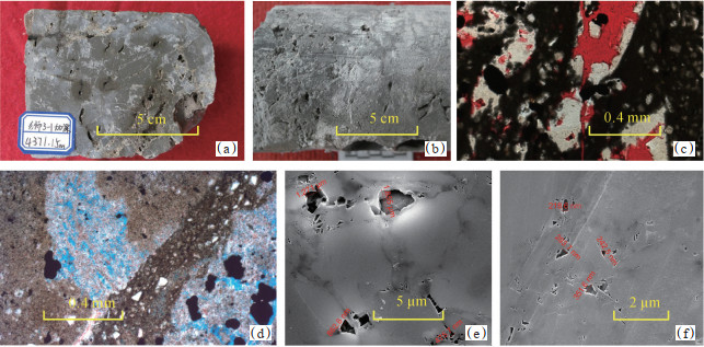 4 TSR对储层的改造TSR的反应机理表明反应发生在硫酸盐类地层与储集层内, 反应后在储层中生成H2S, CO2以及H2O。部分H2S与CO2溶于地层水使地层水酸化, 再与邻近的碳酸盐岩储层发生有机-无机相互作用导致溶蚀作用发生; 高温高压的地层中未溶于地层水中的H2S有强腐蚀性, 使得溶蚀作用更加剧烈, 这是储层发生溶蚀的主要机制。TSR及其引起溶蚀作用是一个相互关联的过程, 溶蚀作用强度受制于TSR的强度。一方面, 反应的不断进行引起地层水酸化、CO2含量增加以及SO42-浓度降低, 使得碳酸盐岩和膏盐的溶蚀作用持续进行; 另一方面, 储层发生溶蚀维持着地层水中SO42-浓度并引起盐度相对增加, 进而促进TSR的进行, 溶蚀同时伴随着碳酸盐沉淀使得H+浓度及H2S浓度降低, 进而抑制反应过程(图 4)[17]。TSR具有双面性, 即溶蚀作用产生次生孔隙优化储层物性的同时, 也会因化学沉淀堵塞部分孔隙, 进而破坏原有的储层物性。总体上, 英西地区下干柴沟组上段的TSR作为一种重要的建设性成岩作用促进溶蚀作用持续进行, 形成溶洞(图 5a, 5b)、溶孔(图 5c)、溶缝(图 5c, 5d)、晶间溶孔(图 5e, 5f)等类型的储集空间。