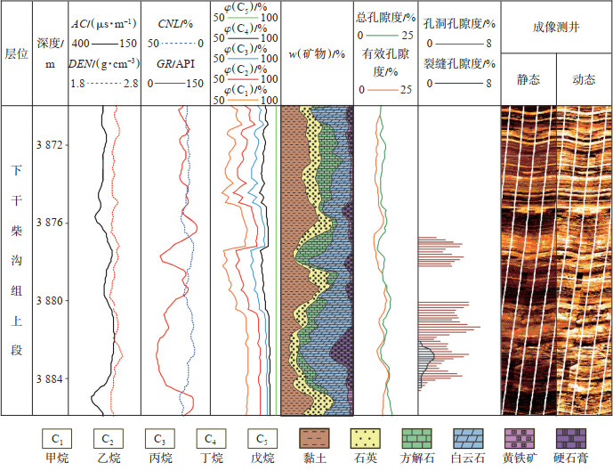 岩性测井显示, 英西地区狮49-1井与狮3-1加深井的主要矿物为黏土、石英、方解石、白云石、黄铁矿以及硬石膏。分析表明, 地层岩性以灰云岩、混积岩(即黏土含量、石英含量、方解石+白云石的质量分数均不超过50%)、白云岩为主, 伴有少量泥岩。狮49-1井储集层以灰云岩、混积岩、白云岩为主, 储层平均孔隙度为7.83%, 平均基质孔隙度为4.66%, 平均裂缝孔隙度为0.13%, 平均孔洞孔隙度为3.04%(3 710~3 970 m)。烃组分与孔洞在3 880~ 3 884 m段存在相关性(图 6), 该段平均孔隙度为8.10%, 平均基质孔隙度为4.23%, 平均裂缝孔隙度为0.38%, 平均孔洞孔隙度为3.48%;孔洞在成像测井的动态图像上呈沿层间裂缝分布的黑色暗斑状, 孔洞与硬石膏、黄铁矿存在正向响应关系。狮3-1加深井储集层以灰云岩、混积岩为主, 平均基质孔隙度为5.86%, 平均孔洞孔隙度为3.28%(3 826~4 490 m)。对2口井的孔隙度综合研究表明, TSR增加的平均孔隙度可达3.5% 左右, 这说明溶蚀作用增加了孔洞空间, 在一定程度上优化了储集体性能。
