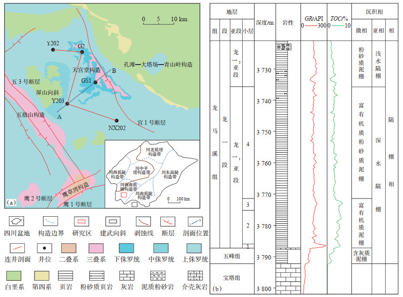 下载原图 图 1 川西南缘天宫堂构造位置(a)和Y203井五峰组—龙马溪组龙一1亚段岩性地层综合柱状图(b) Fig. 1 Structural location of Tiangongtang structure in southwestern margin of Sichuan Basin(a)and comprehensive stratigraphic column of O3w-S1l1-1 in well Y203(b) |