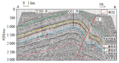 1 地质概况四川盆地地处青藏高原东缘、扬子地台西北侧,是一个经多期构造演化而成的叠合盆地[13],具有盆地周缘造山带向盆地内渐变过渡为平缓的典型构造和地貌盆地特征。根据四川盆地的形成和构造演化特征,将其进一步划分为川北低缓构造带、川中平缓构造带、川东高陡构造带、川西低陡构造带、川西南低褶构造带和川南低陡构造带。天宫堂构造位于川西南低褶构造带,北受川东褶皱冲断带西延影响,南受娄山褶皱带演化控制,其构造南西翼形态相对完整,北部发育有鼻状构造,南西面发育的鹰草湾构造为断裂复杂带。构造两侧的屏山向斜和孔滩—大塔场—青山岭构造地层较平缓。因受多期强隆升改造,天宫堂构造结构复杂,为不规则、外围似菱形、相对完整的箱状背斜构造,背斜核部出露上三叠统须家河组,局部有中三叠统雷口坡组石灰岩出露。构造主体轴向为北西向,高点以北轴向折转为北西西向,西北倾没端基本表现为正西向[14-15],南西翼地层倾角小于10°,北东翼地层倾角为35°~45°,轴线略呈反“S”形延伸,构造整体呈北东翼陡、南西翼缓的特征,其中北东翼被近平行天宫堂构造主轴线的宫1号断层切割(图 1)。由过宫1号断层的地震反射特征(图 2)看出,宫1号断层发育于寒武系,消失在上三叠统须家河组内部,最大落差1 500 m。该断层延伸长25~27 km,倾角为25°~60°,断距随深度增加而增大,发育规模由西北向东南方向逐渐变小。此外,在天宫堂构造主体区内还发育断距小于100 m的断层40余条,多数断层局限在寒武系和奥陶系内部,为加里东期形成的断层体系。