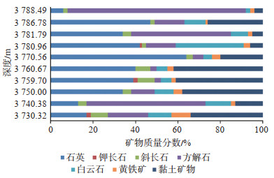 下载原图 图 3 川西南缘天宫堂构造Y203井五峰组—龙马溪组龙一1亚段全岩矿物组分图 Fig. 3 Whole rock mineral composition of O3w-S1l1-1 of well Y203 in Tiangongtang structure, southwestern margin of Sichuan Basin |