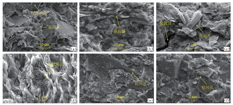 下载原图 图 4 川西南缘天宫堂构造五峰组—龙马溪组龙一1亚段页岩储层孔隙特征 (a)晶间孔、粒内溶孔,Y202井,3 487.99~3 488.19 m;(b)有机质充填的微裂缝,Y203井,3 773.70~3773.75 m;(c)粒间孔与微裂缝,Y202井,3 515.23~3 515.43 m;(d)有机孔,Y203井,3 744.73~3 744.78 m;(e)粒间孔,Y203井,3 773.70~3 773.75 m;(f)粒间孔,Y203井,3 783.63~3 783.68 m Fig. 4 Pore characteristics of O3w-S1l1-1 shale reservoir in Tiangongtang structure, southwestern margin of Sichuan Basin |