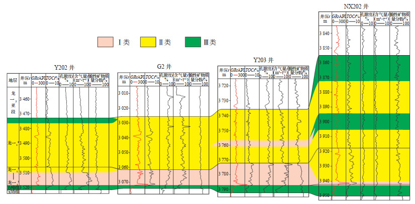 2.3 储层评价研究区龙一11—龙一13较五峰组与龙一14储层物性及含气性更好。据川南五峰组—龙马溪组页岩气储层分类评价标准(表 2),页岩储层可细分为Ⅰ,Ⅱ,Ⅲ共3种类型,其中龙一1亚段纵向上主要发育Ⅰ,Ⅱ类储层,局部发育有Ⅲ类储层,在龙一11—龙一13发育了一套储集性能优越、含气性较好的Ⅰ类储层,厚度为0.8~17.0 m(平均厚度9.0 m),横向展布稳定,呈现由北向中部逐渐增厚、向南近宫1号断层附近明显减薄的趋势,该套储层也是目前主要的开采层。Ⅱ,Ⅲ类储层主要发育于龙一14和五峰组,储层厚度由北向南呈现增大的趋势,TOC含量和孔隙度均较低,含气性较差(参见表 1,图 5)。