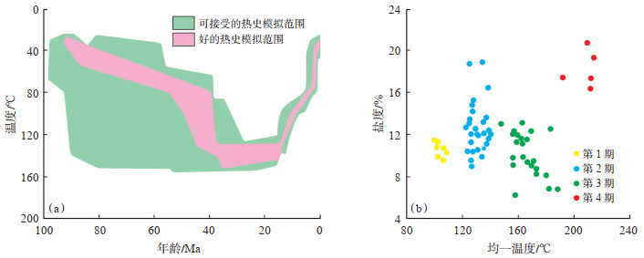 3.1 构造演化根据NX202井磷灰石裂变径迹测量和热演化史分析成果(图 6a)可知,天宫堂构造自新生代早期(距今45~50 Ma)开始缓慢抬升,至25~30 Ma继续以中等速率抬升,进入10 Ma后开始发生快速抬升剥蚀,抬升剥蚀量可达3 500~4 000 m[12]。NX202井包裹体均一温度-盐度相关图(图 6b)揭示,其具有100~110 ℃、120~140 ℃、160~170 ℃以及200 ℃等4套均一温度峰值,显示为4期流体特征。前2期流体以具有相同盐度、中—高均一温度流体特征为主,中、晚2期的高均一温度流体则具有低盐度、高盐度特征分异,表明天宫堂构造在此阶段可能受到一定的淡水流体混合作用影响[12]。