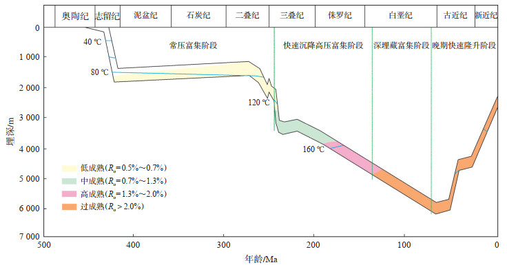 流体性质与构造演化综合分析表明,天宫堂构造主要经历了晚白垩世前快速沉降—深埋藏阶段、晚白垩世后2期抬升改造阶段。在多期沉降—深埋藏背景下,研究区五峰组—龙马溪组于志留纪末期进入生油门限;三叠纪初期干酪根开始大量热解生烃,主要生成液态石油;早侏罗世—早白垩世进入生湿气阶段,早期形成的石油开始裂解;早白垩世—晚白垩世干酪根大量裂解生气,形成压力较高的早期富集型超压页岩气藏;新生代为快速抬升改造阶段,抬升剥蚀总量达到3 500~4 000 m(图 7)。天宫堂构造主断层宫1号断层形成于印支期构造变形期,燕山晚期构造变形再活化,中下三叠系膏盐层系滑脱变形与集中应变强烈,膏盐层系变形揉皱作用明显[22]。燕山晚期—喜马拉雅期构造快速隆升导致该区构造变形强烈,快速抬升剥蚀作用促使宫1号断层附近压力系数骤然降低,气藏存在散失,超压系统被破坏,早期富集型超压页岩气藏逐步向高压—常压页岩气藏调整。