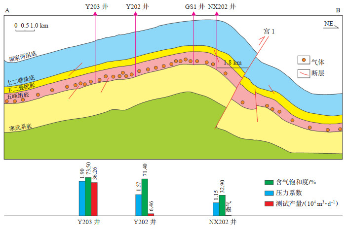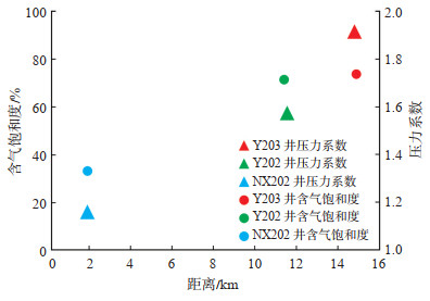 在挤压环境下,构造应力场的最大主应力方向与断裂走向的相互关系影响着断裂的封闭程度。天宫堂构造现今最大主应力方向整体为SEE 80°~100°,与宫1号断层走向呈近垂直相交,揭示了宫1号断层整体上具有一定封堵性。宫1号断层发育于寒武系,消失在上三叠统须家河组内部,断距落差100~1 500 m(参见图 2),不具明显的走滑性质,未形成通天断裂对气藏造成完全破坏,但五峰组—龙马溪组页岩气藏聚集成藏过程中叠加多期构造活动,宫1号断层形成了气藏局部泄压的通道,例如井底距离该断层1.8 km的NX202井压力系数为1.15,含气饱和度为41.2%,测试产微气;距该断层较远的Y202井和Y203井为高压气藏,含气饱和度均在70% 以上,测试获气。经实钻揭示离宫1号断层越近,压力系数越低,天然气含气饱和度越低,但其保存条件未完全破坏,仍有微量页岩气富集;反之井底距离宫1号断层越远,天然气含气饱和度越高(图 8),越趋于高压富集,越易获气。