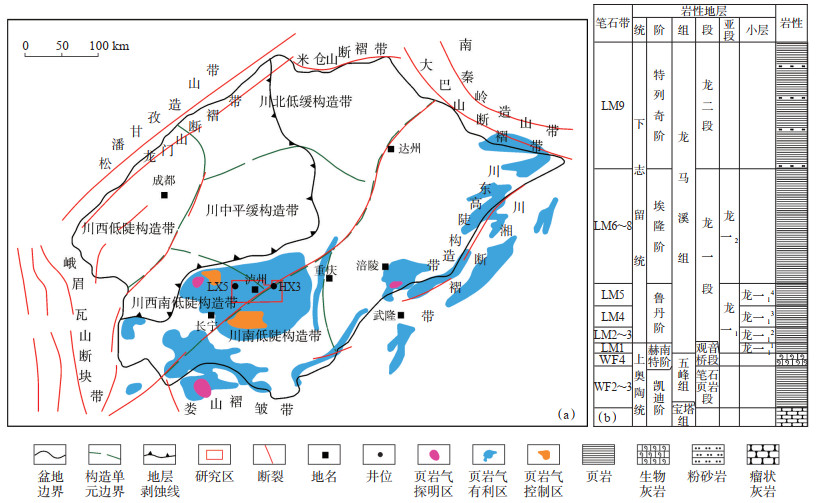 下载原图 图 1 川南泸州地区构造位置和有利页岩气分布(a)及五峰组—龙马溪组岩性地层综合柱状图(b)[20] Fig. 1 Structural location and favorable shale gas distribution(a)and stratigraphic column of Wufeng-Longmaxi Formation(b)in Luzhou area, southern Sichuan Basin |