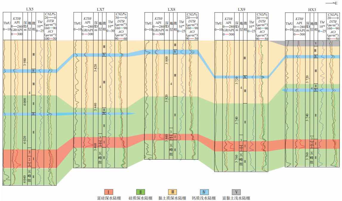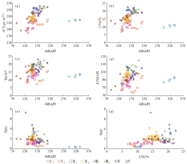 根据不同沉积微相细分类型在测井曲线上的不同响应特征及数值,统计出相应的测井响应特征值范围及平均值(表 2),富硅深水陆棚(Ⅰ)、硅质深水陆棚(Ⅱ)和钙质浅水陆棚(Ⅳ)等3种沉积微相都具有KTH,AC,CNL,DTS及Th含量等均偏低的特征,其中Ⅰ类KTH值最低,GR值相对最高,Ⅱ类GR值次之,Ⅳ类最低;黏土质深水陆棚(Ⅲ)和富黏土浅水陆棚(Ⅴ)均表现为KTH,AC,CNL,DTS和Th含量均相对较高的特征,其中Ⅲ类沉积微相GR值最高。