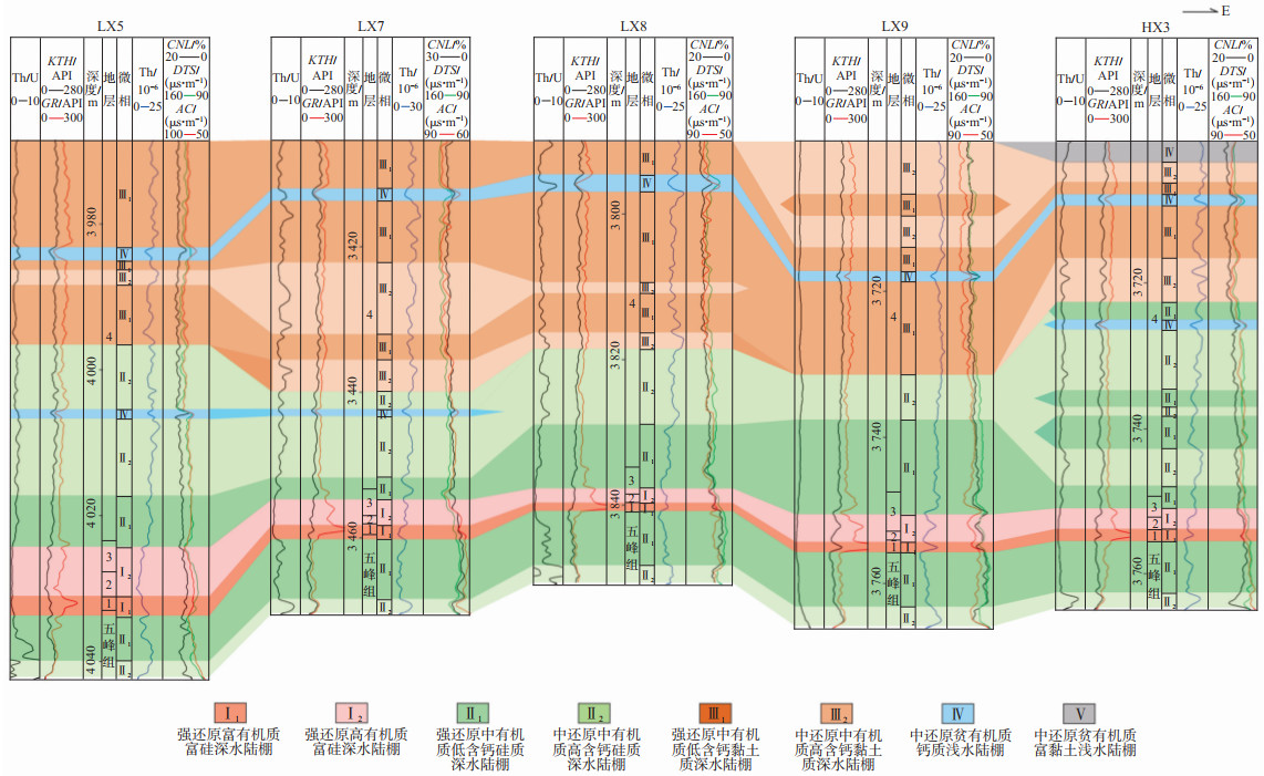 微相细分类型中,强还原富有机质富硅深水陆棚(Ⅰ1)和较强还原高有机质富硅深水陆棚(Ⅰ2)的GR值高;强还原中有机质低含钙硅质深水陆棚(Ⅱ1)与中还原中有机质高含钙硅质深水陆棚(Ⅱ2)相比,KTH、Th/U和Th含量均更低。中还原中有机质高含钙黏土质深水陆棚(Ⅲ2)较强还原中有机质低含钙黏土质深水陆棚(Ⅲ1)的Th/U高。