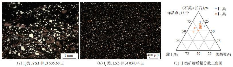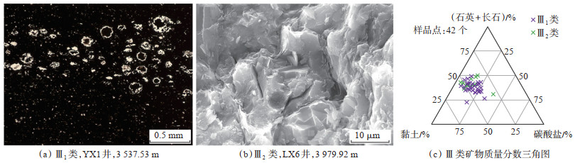 2.2.4 钙质浅水陆棚钙质浅水陆棚分布较少,主要分布在龙一14中部,沉积水体较浅,厚度为3~6 m,微相细分类型为中还原贫有机质钙质浅水陆棚(Ⅳ)。发育钙质硅质混合页岩、黏土质钙质混合页岩及钙质页岩,其中硅质、黏土质、钙质和黄铁矿的平均质量分数分别为38%,34%,26% 和2%,Th/U均值为4.7,以中还原环境为主,TOC质量分数为1.5%,孔隙度为3.4%,含气量为2.45 m3/t。薄片中局部可见粉粒石英、粉晶白云石等顺层分布形成水平亮纹层,与泥质暗色纹层不等厚互层,黄铁矿多呈粉末状分散分布(图 5a,5c)。
