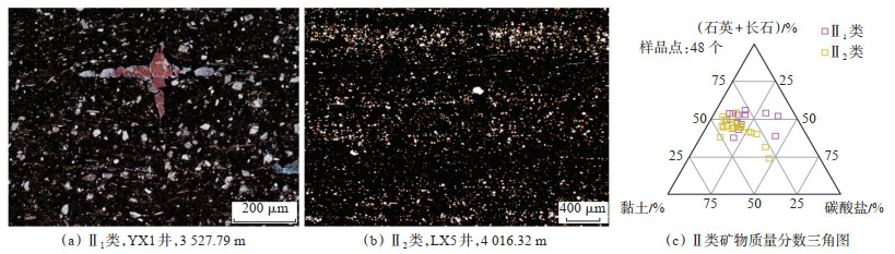 (1)强还原中有机质低含钙硅质深水陆棚(Ⅱ1):钙质和黏土质的平均质量分数分别为14% 和30%,Th/U均值为1.3,TOC质量分数为2.8%,孔隙度为3.6%,含气量为3.81 m3/t。薄片可见粉砂颗粒及由方解石(粉红色)和铁方解石(紫色)组成的非生物碎片(图 3a)。