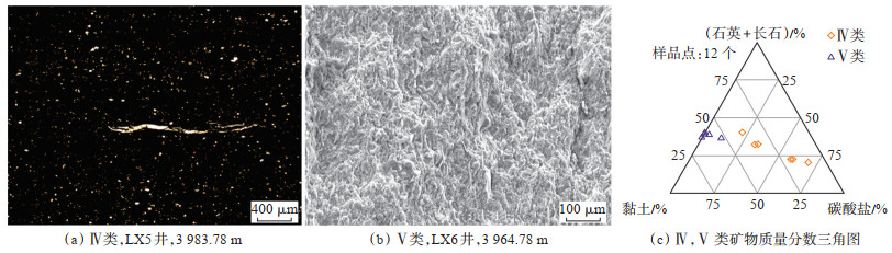 富黏土浅水陆棚主要发育于龙一14上部,微相细分类型为中还原贫有机质富黏土浅水陆棚(Ⅴ),厚度约4 m。岩性为黏土质页岩,硅质、黏土质、钙质和黄铁矿的平均质量分数分别为37%,56%,5% 和2%,Th/U均值为3.2,以中还原环境为主,TOC质量分数为0.8%,孔隙度为4.0%,含气量为0.79 m3/t,电镜下可见泥质呈纹层状分布,局部发育微裂缝(图 5b,5c)。