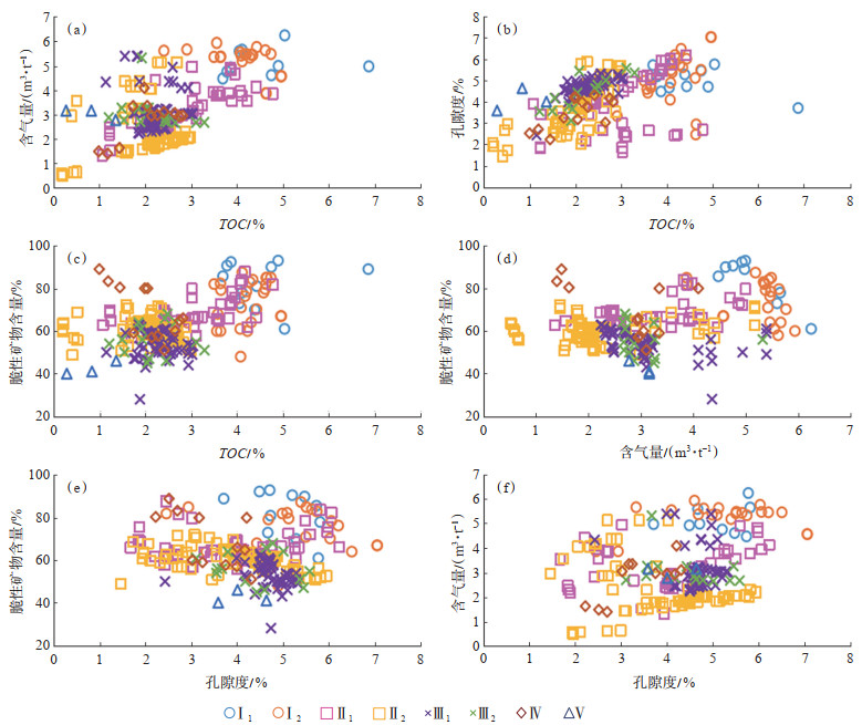 对采自LX5井、HX3井和LX6井等3口井的146块样品进行了X射线衍射,并将8种不同微相的物性(孔隙度)、TOC含量、脆性矿物含量及含气量等数据进行了交会分析(图 6)。结果显示强还原富有机质富硅深水陆棚(Ⅰ1)多分布在交会图中的右上方,各参数值均处于一个较高区间内,其中该微相细分类型的孔隙度为4.0%~6.0%,含气量为4.00~6.00 m3/t,其中脆性矿物含量及TOC含量在8种类型中最高,脆性矿物质量分数为70%~90%,TOC质量分数为4.0%~7.0%。相对于其他微相细分类型,该类型具有孔隙度较高,含气量较高,有机质丰富,脆性矿物含量最高的特点,是研究区内最有利的“甜点”相带。