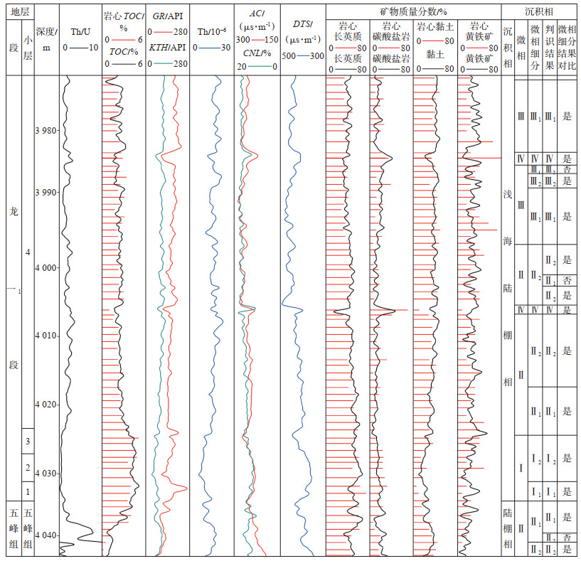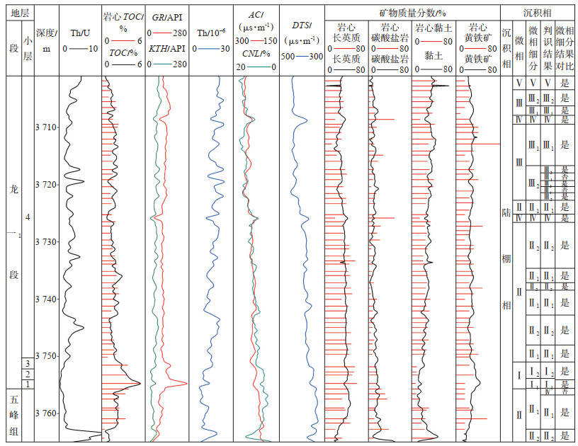 2.1 细分方案川南泸州地区五峰组—龙马溪组沉积时期为陆棚相,整体表现为无氧、贫氧环境,水体安静且深,有利于有机质保存[25],但由于各处古地貌、沉积环境、水体深浅相对变化的不同,有机质的聚集程度也有所差异。以总有机碳(TOC)质量分数2.0% 为界限,可将陆棚环境划分为深水陆棚(TOC ≥ 2.0%)和浅水陆棚(TOC < 2.0%)2种亚相。充分参考已有对陆棚相划分的研究成果[26-29],对比目的层Th/U、TOC含量及矿物组分自身特征及相互牵制关系,制定出以“Th/U反映氧化还原性强弱、TOC含量高低、岩石无机矿物组分含量”三重信息为基础的微相细分方案(表 1)。将深层页岩气地层微相细分为了五大类8个小类:强还原富有机质富硅深水陆棚(Ⅰ1)、强还原高有机质富硅深水陆棚(Ⅰ2)、强还原中有机质低含钙硅质深水陆棚(Ⅱ1)、中还原中有机质高含钙硅质深水陆棚(Ⅱ2)、强还原中有机质低含钙黏土质深水陆棚(Ⅲ1)、中还原中有机质高含钙黏土质深水陆棚(Ⅲ2)、中还原贫有机质钙质浅水陆棚(Ⅳ)、中还原贫有机质富黏土浅水陆棚(Ⅴ)。