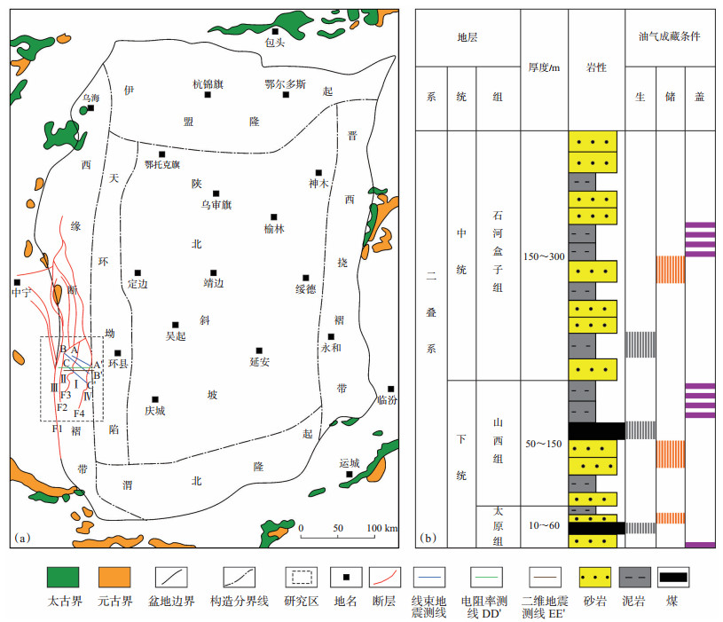 下载原图 图 1 鄂尔多斯盆地西缘银洞子地区构造位置(a)及二叠系岩性地层综合柱状图(b) F1.青铜峡—固原断裂;F2.韦安断裂;F3.青平断裂;F4.惠沙断裂;Ⅰ.沙井子隐伏构造带;Ⅱ.银洞子隐伏构造带;Ⅲ.严家湾隐伏构造带;Ⅳ.惠沙断裂下盘隐伏构造带 Fig. 1 Structural location(a)and stratigraphic column of Permian(b)in Yindongzi area, western margin of Ordos Basin |