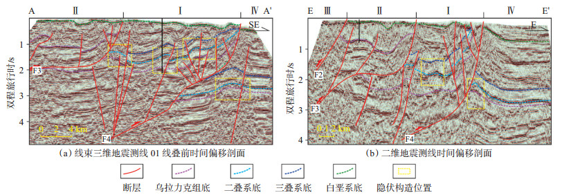 YT2井位于沙井子隐伏构造带内,已钻遇下古生界,钻深达4 400 m(图 2a)。钻探结果显示,在沙井子隐伏构造带内,上古生界地层和下古生界地层均发育完整,地层层序正常。YT1井位于银洞子隐伏构造带内,钻入基底84 m(图 2b),钻探结果显示,在银洞子隐伏构造带内缺失上古生界地层及中生界部分地层,下古生界地层完整,白垩系地层直接覆盖在下古生界地层之上。利用YT1井和YT2井进行井震层位标定,进一步明确了银洞子地区的构造模式为典型的前展式逆冲构造,且自西向东发育有韦安断裂、青平断裂、惠沙断裂,3条断裂均为基底卷入型逆断层,逆冲距离长,在地震剖面上表现为上陡下缓的形态。银洞子隐伏构造带和沙井子隐伏构造带内均伴生断层。燕山期,研究区由于受到自西向东的强烈推覆应力作用,二叠系地层发生褶皱、断层变形,从而在惠沙断裂及青平断裂下盘形成多个隐伏构造。