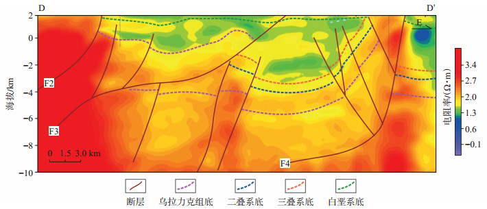 利用电法勘探与地震勘探相结合的方法对山前复杂构造区深部宏观构造格局进行研究具有极其重要的价值[18-20]。白垩系—三叠系为低电阻层,中上奥陶统以下地层为高电阻层电阻率剖面的构造解释与地震解释的构造形态一致,且韦安断裂、青平断裂、惠沙断裂均表现为“下缓上陡”的特征(图 3)。