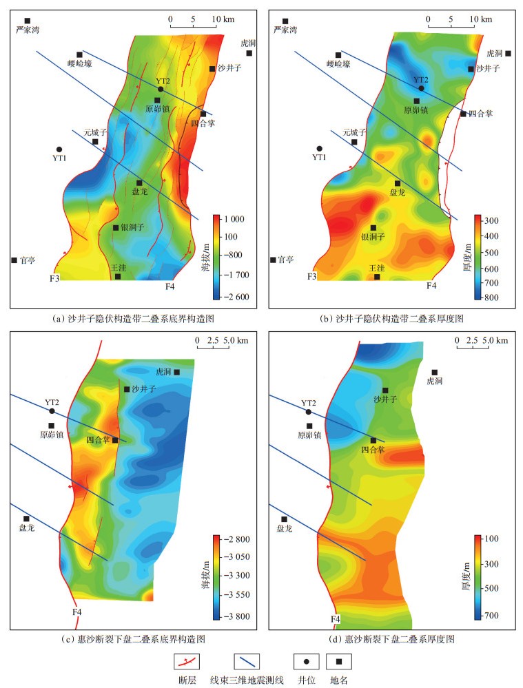 结合新部署的线束三维01,02,03线的最新成果,认为在鄂尔多斯盆地西缘银洞子地区二叠系发育2个隐伏构造带。其中,在沙井子隐伏构造带内各层系均有发育,二叠系地层整体表现为“东高西低、南凹北隆”的构造格局(图 4a),地层表现为北厚南薄的沉积特征(图 4b);在惠沙断裂下盘隐伏构造带内,二叠系地层向西逐步抬升,紧邻断裂下盘发育面积较大的背斜(图 4c),地层展布规律与沙井子隐伏构造带相似,二叠系地层同样表现出北厚南薄的沉积特征,并具有一定的继承性(图 4d)。