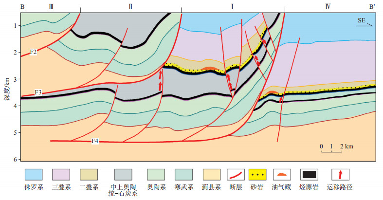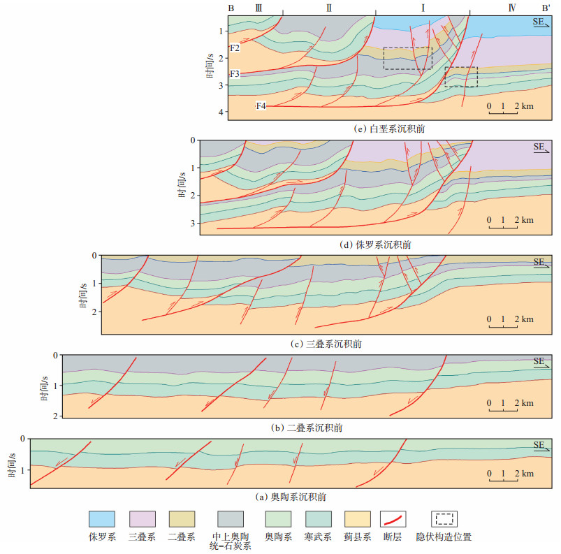 下载原图 图 5 鄂尔多斯盆地西缘南段BB' 构造演化剖面 F2.韦安断裂;F3.青平断裂;F4.惠沙断裂;Ⅰ.沙井子隐伏构造带;Ⅱ.银洞子隐伏构造带;Ⅲ.严家湾隐伏构造带;Ⅳ.前缘带 Fig. 5 Structural evolution profile of BB' in southern section of western margin of Ordos Basin |