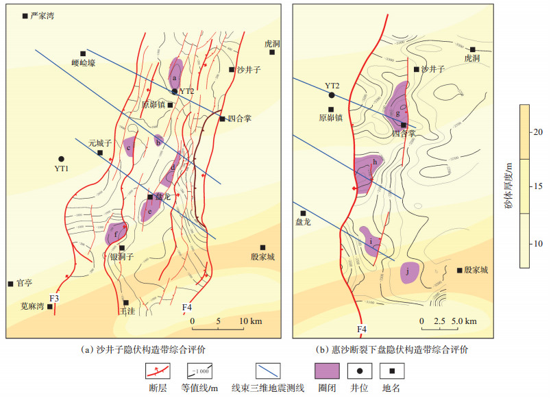 鄂尔多斯盆地西缘南段隐伏构造带内二叠系具有良好的生、储、盖组合。本文对惠沙断裂上、下盘分别进行勘探有利区评价[29-30],上盘二叠系底面构造整体表现为东高西低的特征,断裂非常发育,为近南北向,同时受断裂控制,发育断背斜、断鼻型圈闭,总面积52 km2(图 7a);下盘储层砂体发育,圈闭类型以断鼻、断背斜、背斜为主,总面积54 km2,构造稳定,利于油气后期保存(图 7b)。