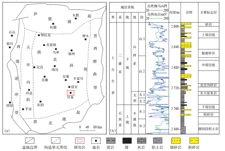 1 地质概况甘泉地区位于鄂尔多斯盆地二级构造单元陕北斜坡东南部(图 1),面积约为1.6×104 km2,区内构造简单,地层较为平缓,倾角整体小于1°,发育一系列鼻状隆起。研究区上古生界底部与下古生界呈平行不整合接触,中间缺失中—上奥陶统、志留系、泥盆系及下石炭统,顶部与中生界呈整合接触,上古生界内部沉积较为连续,均为整合接触,以海陆过渡相—内陆湖盆沉积为主。地层自下而上发育石炭系本溪组和二叠系太原组、山西组、下石盒子组、上石盒子组和石千峰组,上古生界厚度在该区比较稳定,平面上变化较小。