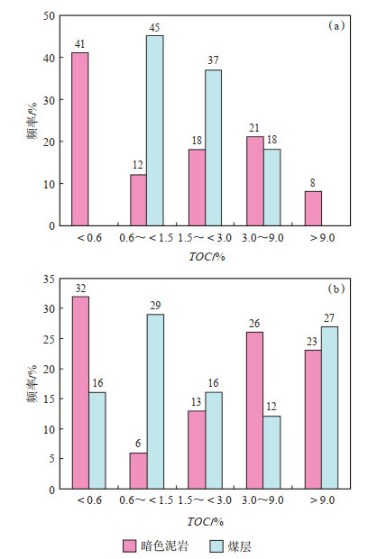 3.1.1 TOC含量TOC含量实验测定结果(图 2)显示,甘泉地区本溪组暗色泥岩TOC质量分数为0~11.9%,平均为1.9%,约41% 的样品TOC质量分数小于0.6%,47% 的样品TOC质量分数大于1.5%,根据含煤地层烃源岩有机质丰度评价标准[22],接近半数的样品为中等或以上级别的烃源岩;煤层TOC质量分数为0.9%~8.8%,平均为2.8%,所有样品均为有效烃源岩,其中55% 的样品为中等或以上级别的烃源岩。山西组暗色泥岩TOC质量分数为0~20.8%,平均约为2.7%,62% 的样品为中等或以上级别的烃源岩;煤层TOC质量分数为1.3%~63.5%,平均为5.1%,57% 的样品为中等或以上级别的烃源岩。由此可见,研究区山西组和本溪组烃源岩整体均较好,山西组烃源岩明显优于本溪组,更有利于生排烃。